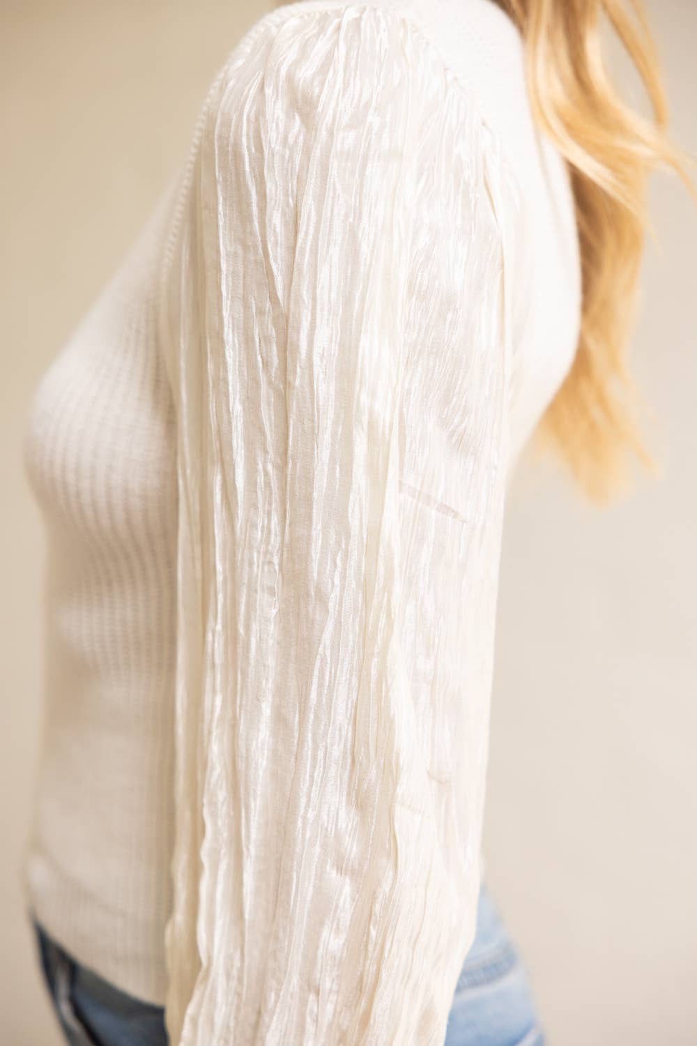 The Bow Tie Blouse elegantly blends classic and contemporary styles with its high neckline and long sleeves. Crafted from a solid ribbed sweater knit, the body offers a refined and structured silhouette, while the crinkled woven sleeves add subtle texture and visual interest. Designed with self-tie cuffs, this blouse provides a delicate, adjustable detail that enhances its sophisticated appeal. Perfect for both professional settings and polished casual looks, it pairs seamlessly with tailored trousers or skirts. The model is 5'8" and wears a size Small.