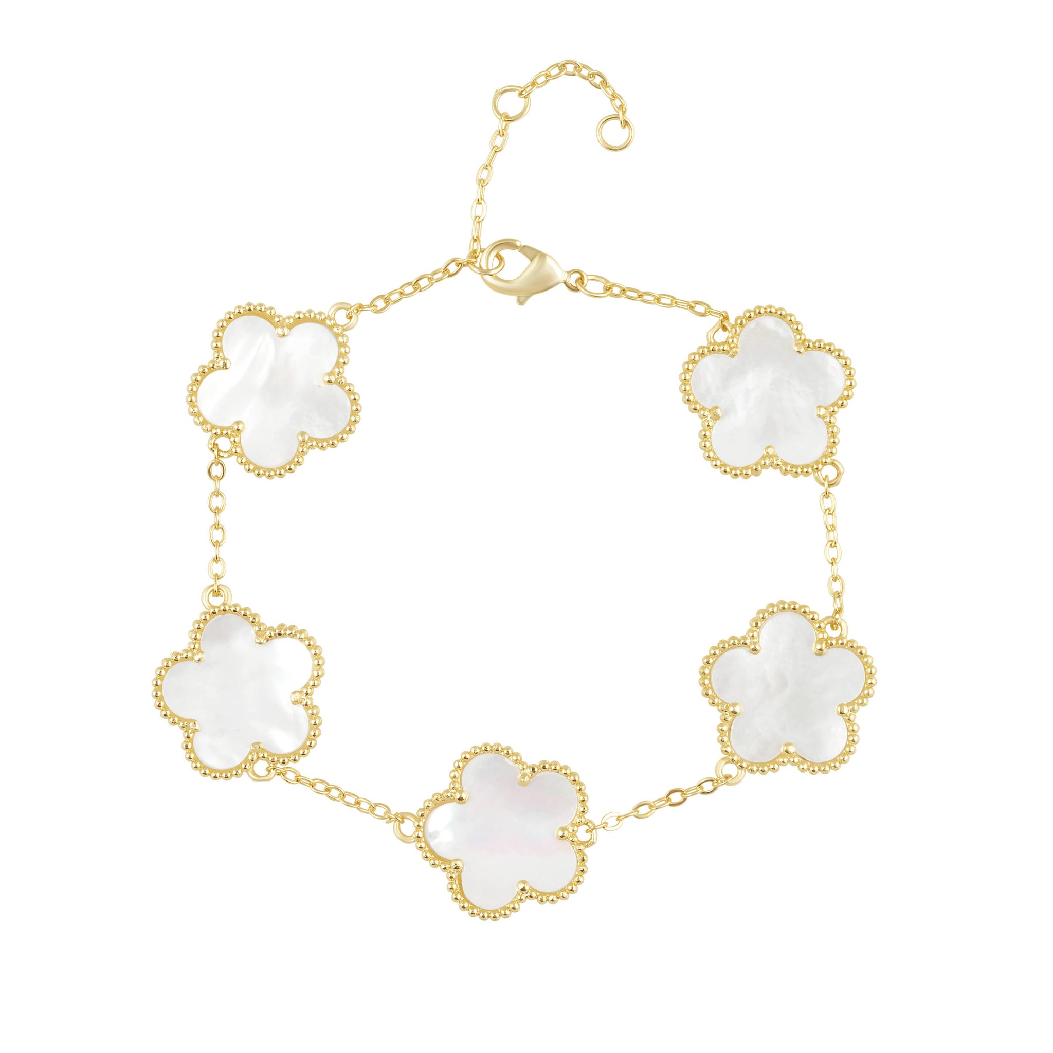 Designed with lustrous mother of pearl, this elegant bracelet is sure to attract admiration wherever it is worn. Enhance your look with this dazzling piece that adds a refined touch to any outfit. (We’d be clover with delight if you chose to wear it!) * 18k gold plated stainless steel * Water and tarnish resistant * 7" length