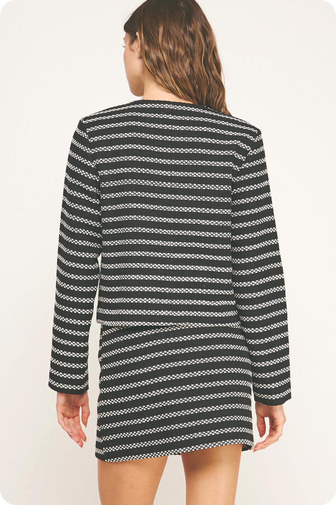 Studio Strut and Bolt Collection. Cardigan tailored jacket in striped texture tweed fabric. This versatile classic jacket features all over stripe pattern, button closure at front, front pockets, light shoulder pads, lining, and a tailored silhouette.