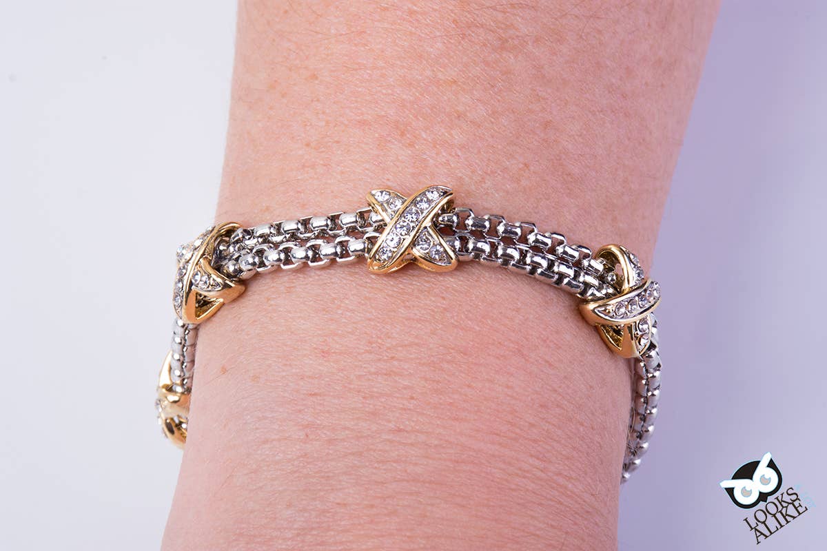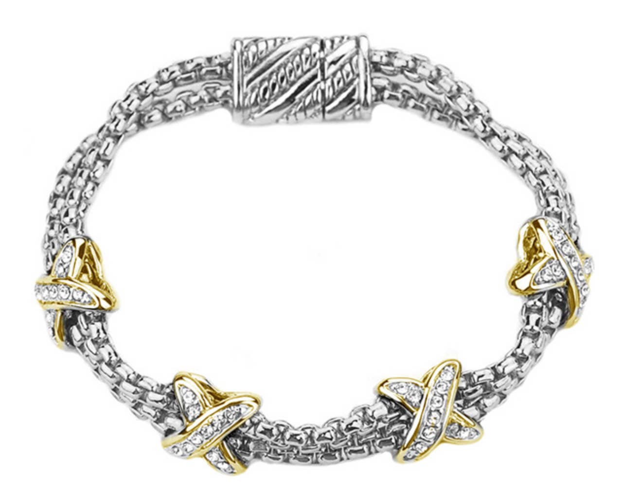 Elegant two-tone design meets timeless sophistication in this crystal-adorned station bracelet. Featuring lustrous rhodium plating and sparkling crystal accents positioned along the length, this refined piece offers both visual interest and wearable luxury. The secure magnetic closure ensures effortless fastening, while the perfectly proportioned 7.5" length provides a comfortable, flattering fit for everyday elegance.